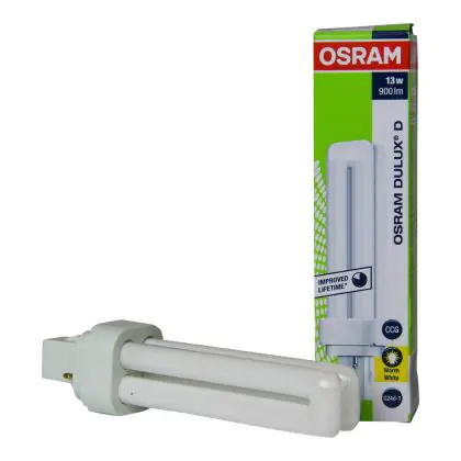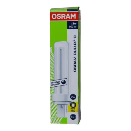The Osram Dulux D can be used in combination with a conventional ballast. The lamp has a short and compact lamp base type G24d-1. This means that each of these compact fluorescent lamps has a base with 2 pins. The lamps Osram Dulux D 13W 830 has a length of 138 mm.