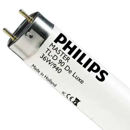 Philips TL-D 90 De Luxe are high quality fluorescent tubes that offer an excellent luminous flux. These tubes can bring out the beauty of your objects' colors that appear to be in day light. They correspond with the high-end version of the Philips TL-D Super 80.Each fluorescent tube of the range has a G13 base type. Philips TL-D 90 De Luxe 36W 940 - 120cm lamps have a size of 120 cm.